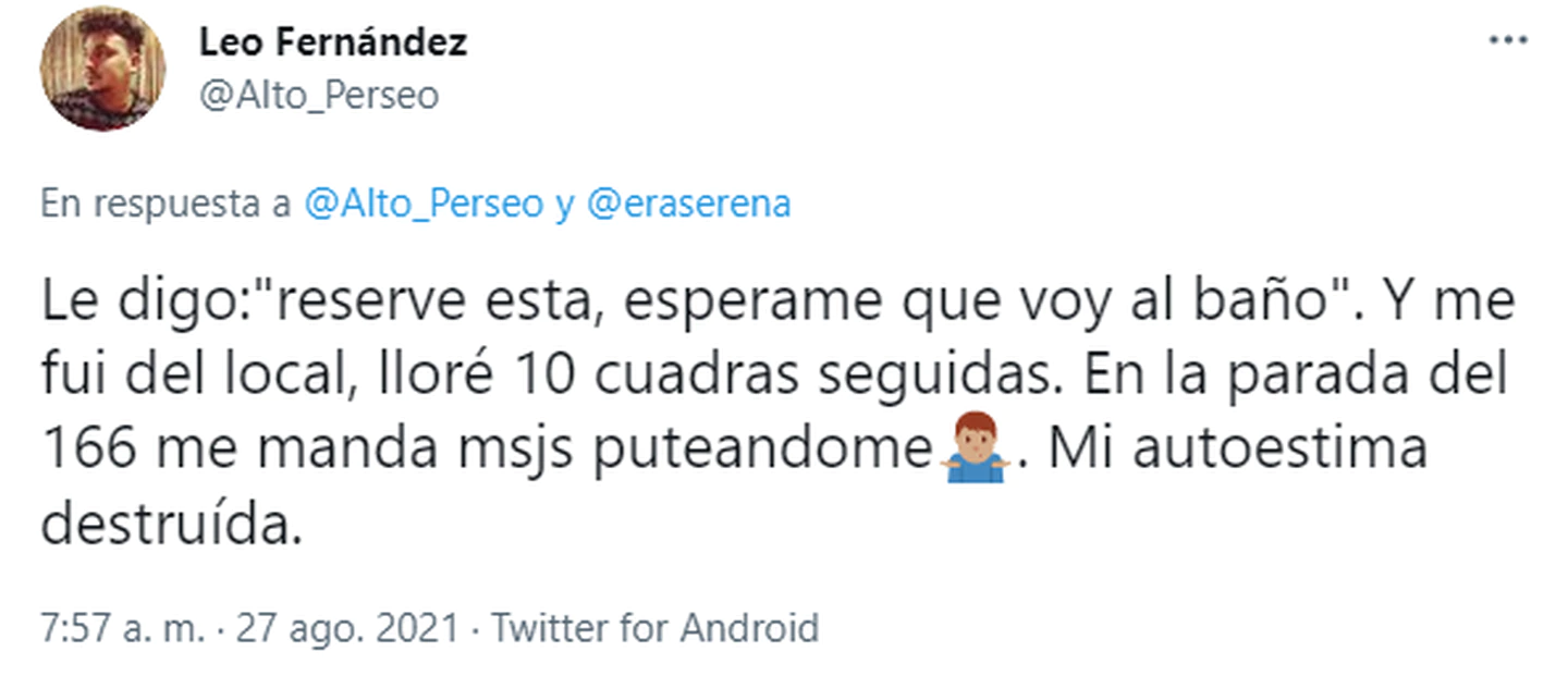 Cualquiera podría imaginar que frente a semejante frase discriminatoria el joven respondió automáticamente con una grosería. Pero no fue así, sino todo lo contrario. “Le digo: ‘reserve esta, esperáme que voy al baño’. Y me fui del local, lloré 10 cuadras seguidas. En la parada del 166 me manda mensajes puteándome. Hombre encogiendo los hombros. Mi autoestima destruida”.