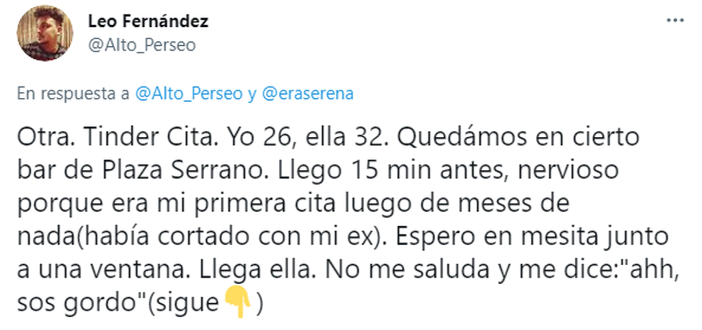 Por su parte, un joven llamado Leonardo Fernández cuyo usuario es @Alto_Perseo contó: “Otra. Tinder Cita. Yo 26, ella 32. Quedamos en cierto bar de Plaza Serrano. Llego 15 min antes, nervioso porque era mi primera cita luego de meses de nada (había cortado con mi ex). Espero en mesita junto a una ventana. Llega ella. No me saluda y me dice: ‘ahh, sos gordo’”.