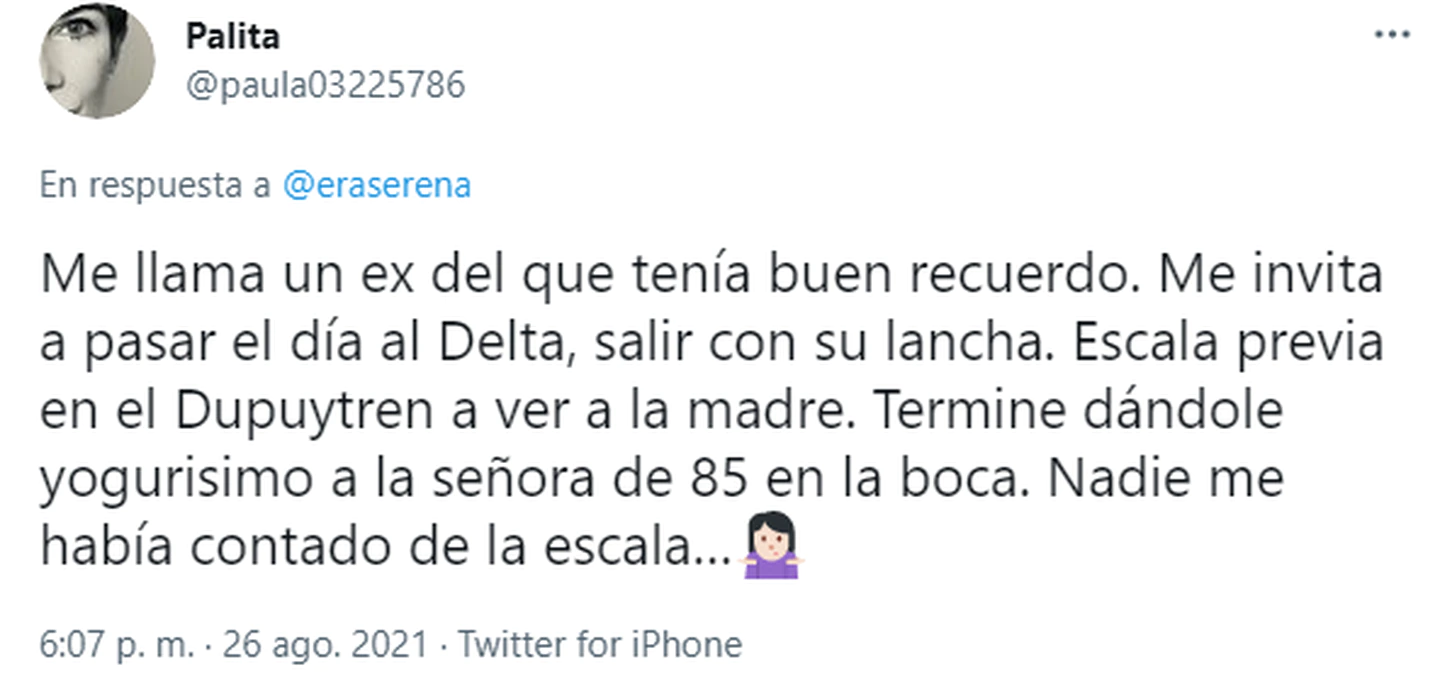 Otra escena de no creer, aunque al mismo tiempo algo tierna, fue la que le tocó vivir a la usuaria @paula03225786: “Me llama un ex del que tenía buen recuerdo. Me invita a pasar el día al Delta, salir con su lancha. Escala previa en el Dupuytren a ver a la madre. Termine dándole yogurisimo a la señora de 85 en la boca. Nadie me había contado de la escala…”.