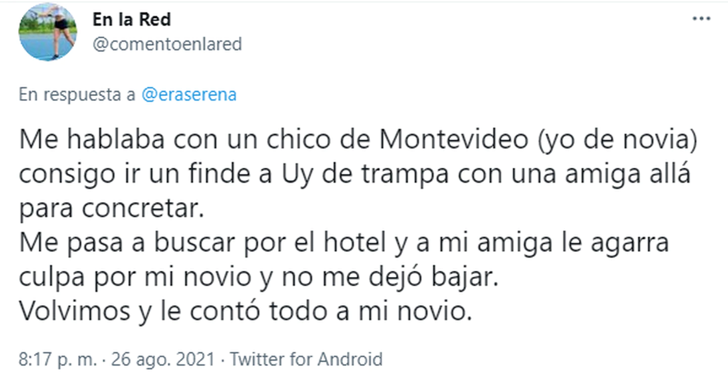 Tras esto su “confesión” fue respondida con miles de mensajes de otros usuarios de la mencionada red social que quisieron hacer público su fracaso amoroso. Una de ellas fue @comentoenlared, que posteó: “Me hablaba con un chico de Montevideo (yo de novia), consigo ir un fin de semana a Uruguay de trampa con una amiga para concretar. Me pasa a buscar por el hotel y a mi amiga le agarra culpa por mi novio y no me dejó bajar. Volvimos y le contó todo a mi novio”.