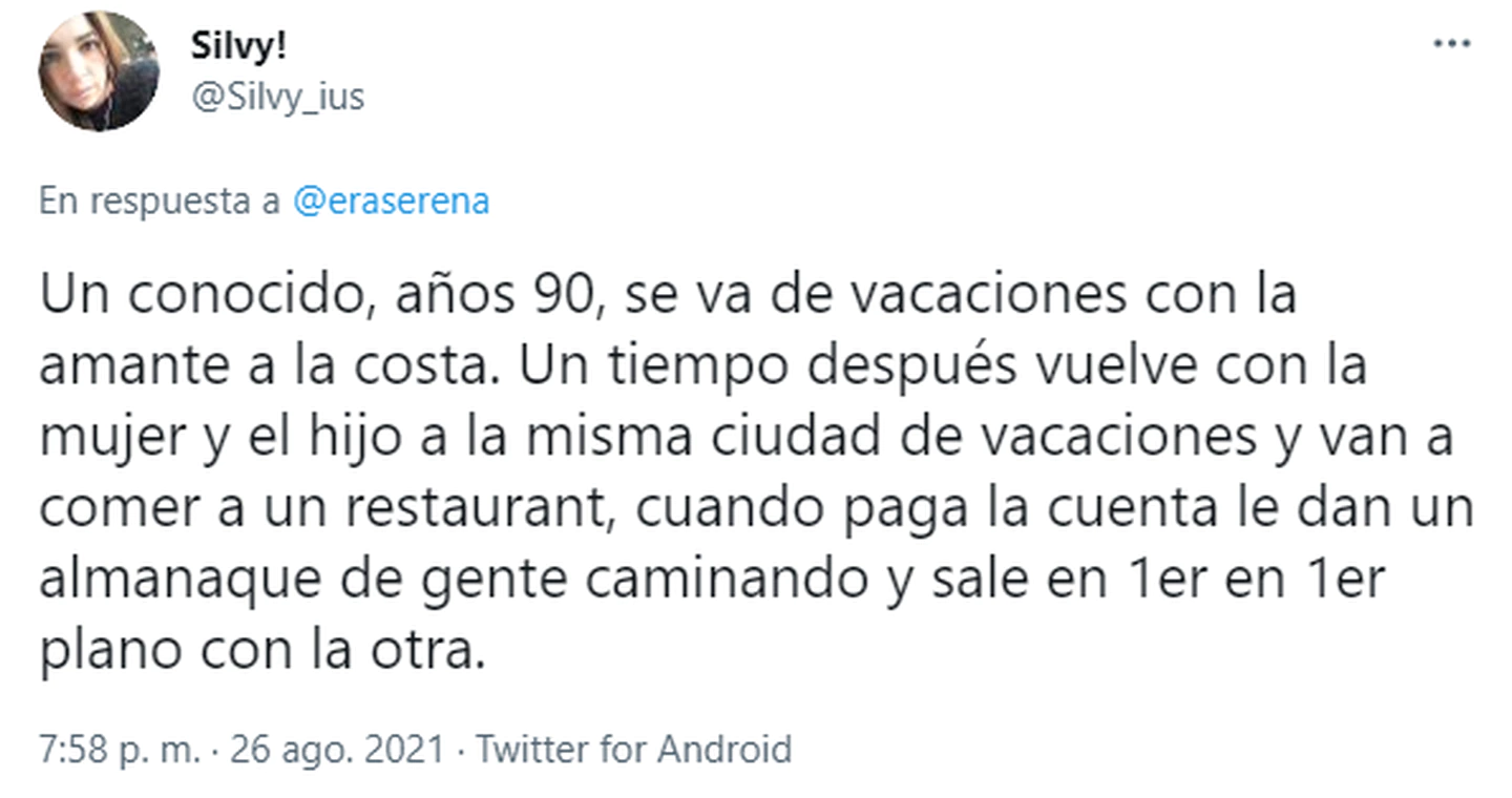 En el hilo que Ana de Breuil abrió en Twitter también hubo para contar situaciones insólitas. Una de ellas fue la que sacó a la luz la usuaria @Silvy_ius: “Un conocido, años 90, se va de vacaciones con la amante a la costa. Un tiempo después vuelve con la mujer y el hijo a la misma ciudad de vacaciones y van a comer a un restaurant, cuando paga la cuenta le dan un almanaque de gente caminando y sale en primer plano con la otra”.