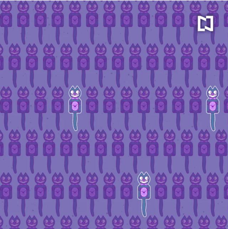 La gracia de este reto es vencer la ilusión óptica que nos genera la imagen de estos gatos azulados con bordes violetas en contraste con el fondo turquesa. También se espera que superemos el mecanismo que tiene nuestro cerebro de simplificar lo que ve.