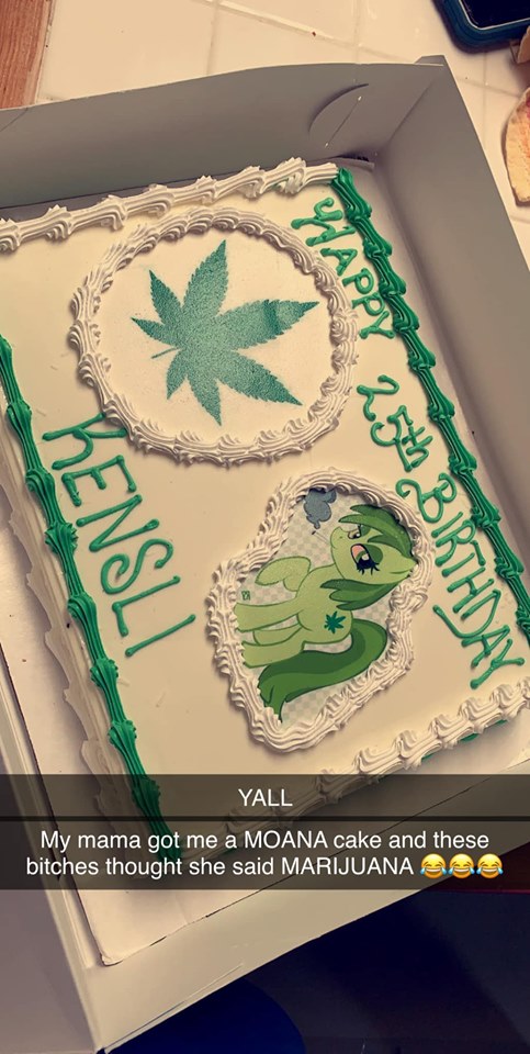 Kensli Davis, de Estados Unidos, celebraba su cumpleaños con amigos y familiares, y su madre decidió colaborar con la torta. El personaje para decorar la misma sería “Moana”, de quien la joven es fanática. Sin embargo, al realizar el pedido, la pastelería a cargo de producirla comprendió de manera equívoca y entendieron que quería un pastel basado en la marihuana.