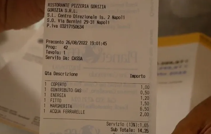 Así lo muestra una cuenta que ya compartieron varios medios italianos, en la que además del precio de una pizza Margherita, una Coca Cola, el postre y el café, aparece el de la luz (1,20 euros) y el gas (0,50 euros). Traducido a pesos argentinos, el restaurante cobra $173 por la luz y $72,15 por el gas para llamar la atención de los clientes a esta problemática que preocupa a innumerables empresarios.