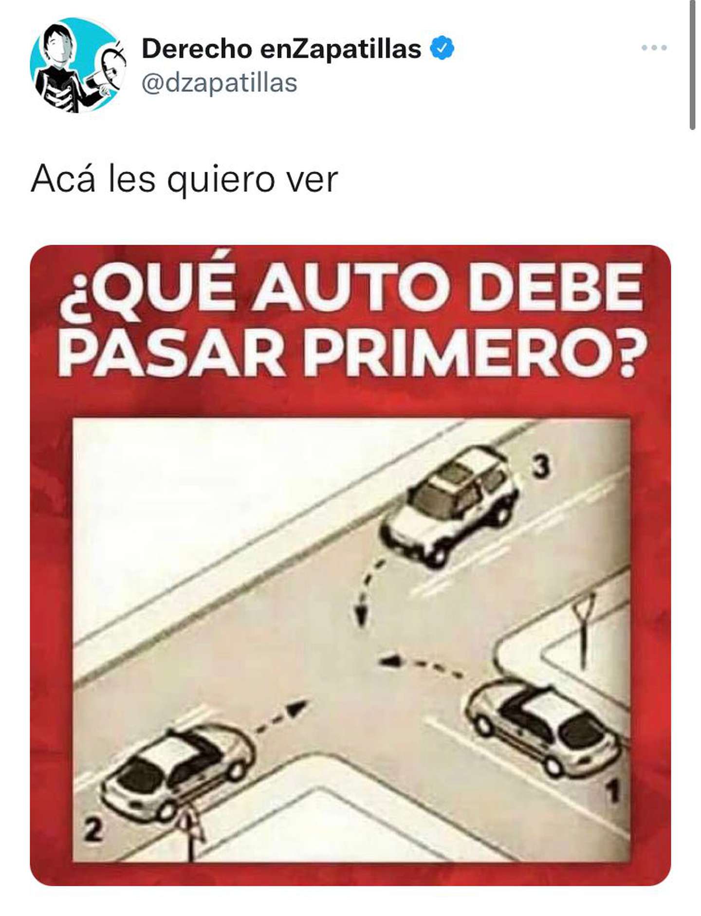 “¿Qué auto debe pasar primero?” preguntó Derecho en Zapatillas (@dzapatillas), un famoso tuitero especializado en “derecho práctico para tod@s en el día a día” (así se presenta en su biografía. Y su publicación armó un revuelo bárbaro, con más de 1700 respuestas y debates acalorados entre los usuarios de la red social.