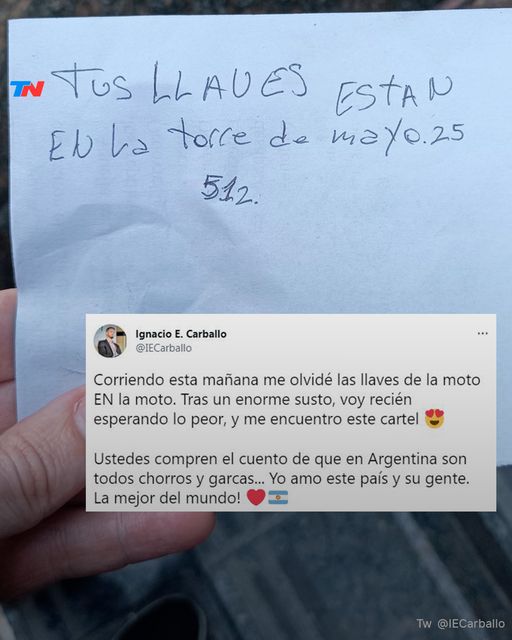 “No las tenía conmigo, las empecé a buscar en la oficina sin expectativas. Regresé a la moto y me topé con esa sorpresa”, expresó Carballo, que en sus redes compartió el cartel que le habían dejado: “Tus llaves están en la torre de Mayo 25″.