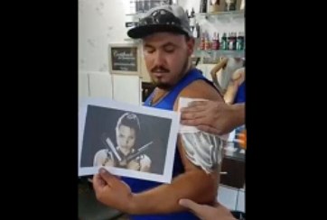 En el video se logra ver al hombre vistiendo una musculosa azul y una gorra mientras sostiene una hoja donde se ve el dibujo por el cual había pagado para que se lo pintaran en su brazo izquierdo.