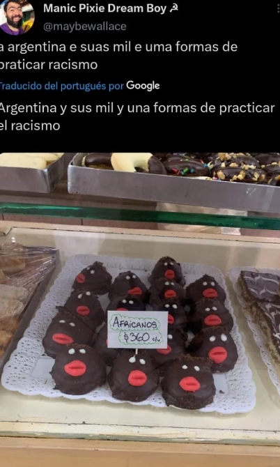 Resulta que el hombre se encuentra en Argentina desde hace un tiempo y cada vez se sorprende más con algunas características. En un día normal, ingresó a una panadería con el objetivo de comprar algo para comer y se llevó una increíble sorpresa cuando vio la vidriera. "Argentina y sus mil y una formas de practicar el racismo", escribió en la descripción del tuit. En la foto se puede ver claramente un producto comestible dulce.