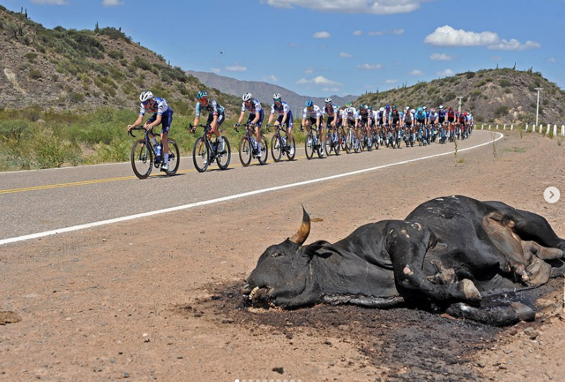 Si bien no especificó en la publicación en cual de las etapas registró la postal, es una cruda imagen de la naturaleza misma en pleno desierto. Una vaca muerta al costado de la ruta y el pelotón pasando detrás impacta. El animal vacuno yace al costado del camino y en aparente estado de descomposición.