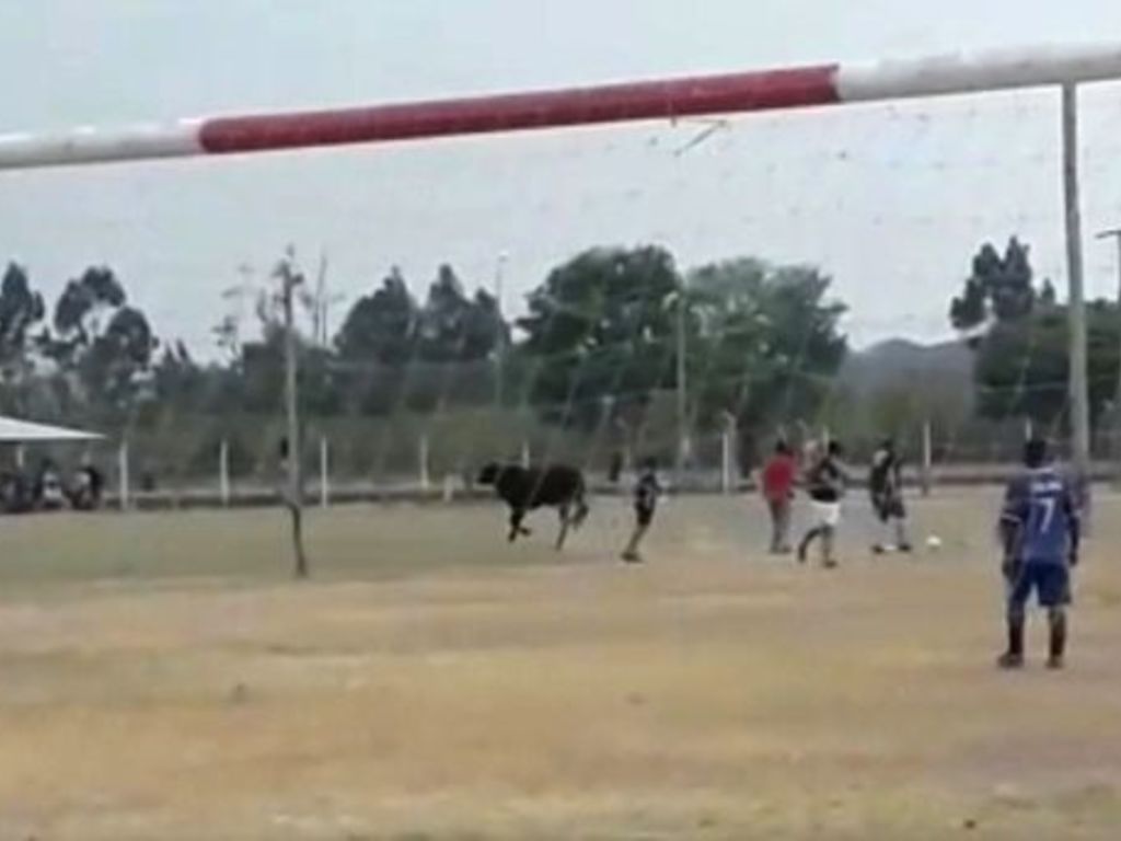 Fuentes policiales señalaron que el animal ingresó al campo de juego luego de haberse escapado de su dueño o de un matadero de la zona, lo que se investiga, y era buscado anoche efectivos policiales.