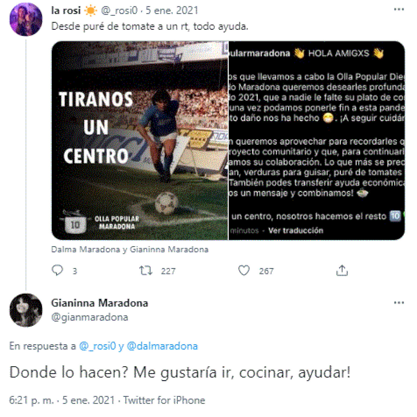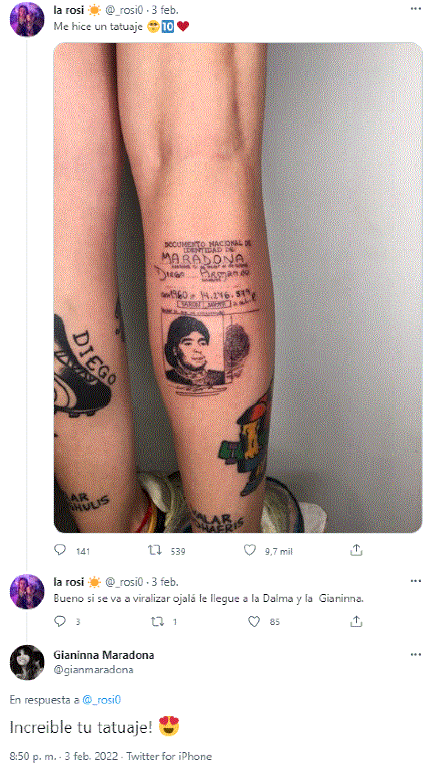 El tatuaje que rápidamente se viralizó en redes sociales fue visto por tres de las hijas de Diego: Dalma, Jana y Giannina. Justamente esta última la felicitó por Twitter. “Giannina me respondió un tuit asegurando que le parecía increíble mi tatuaje. Con ella intercambié unas palabras muy agradables, y además me ayudó con una olla popular que se hizo en José Mármol. No podía creer que había hablado con ella. Eese día lloré mucho”, admitió la joven.