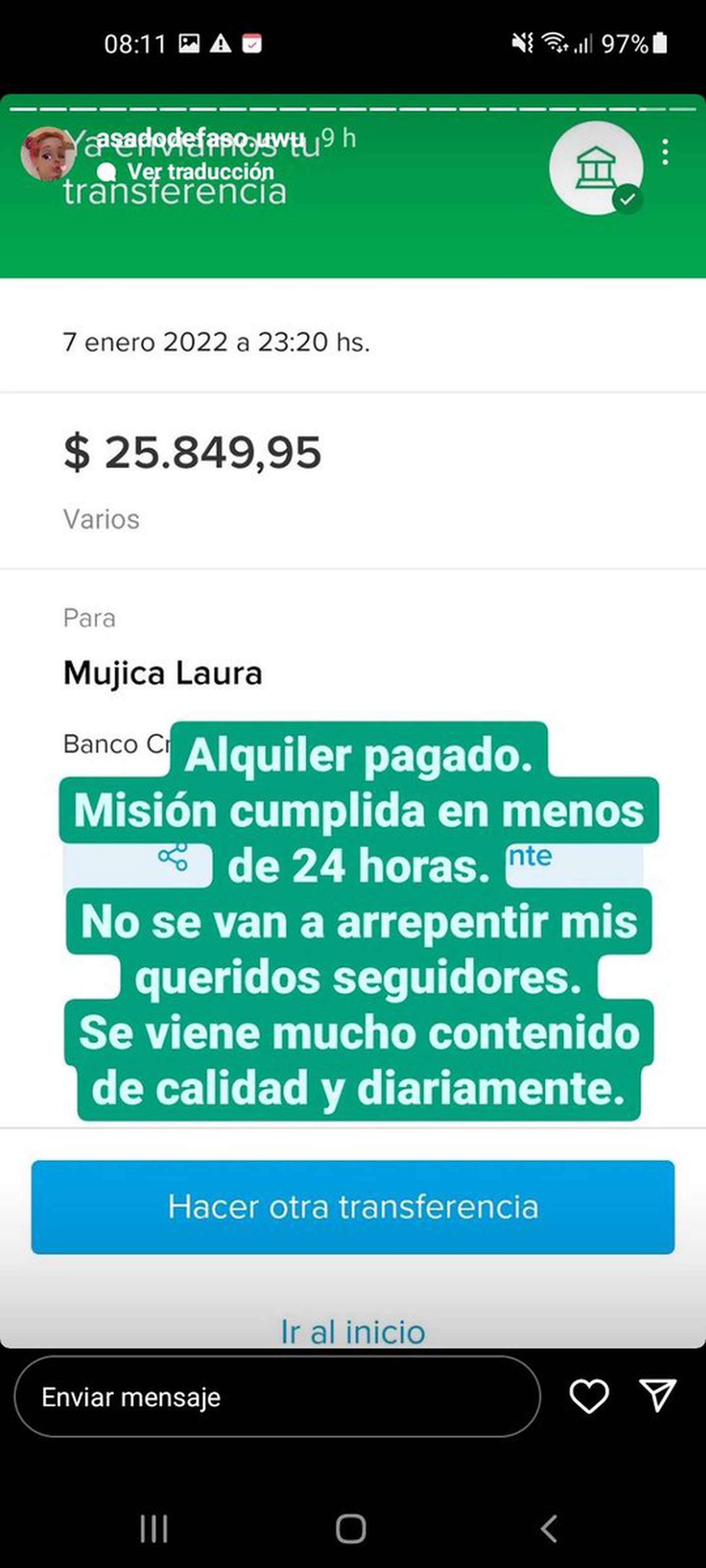 “Yo creo que se coparon porque les gusta mi contenido. Si no puedo pagar el alquiler e Internet, dejaría de publicar videos e historias. Y como la gente disfruta de mi contenido, me expresan su apoyo a través de donaciones”, indicó.
