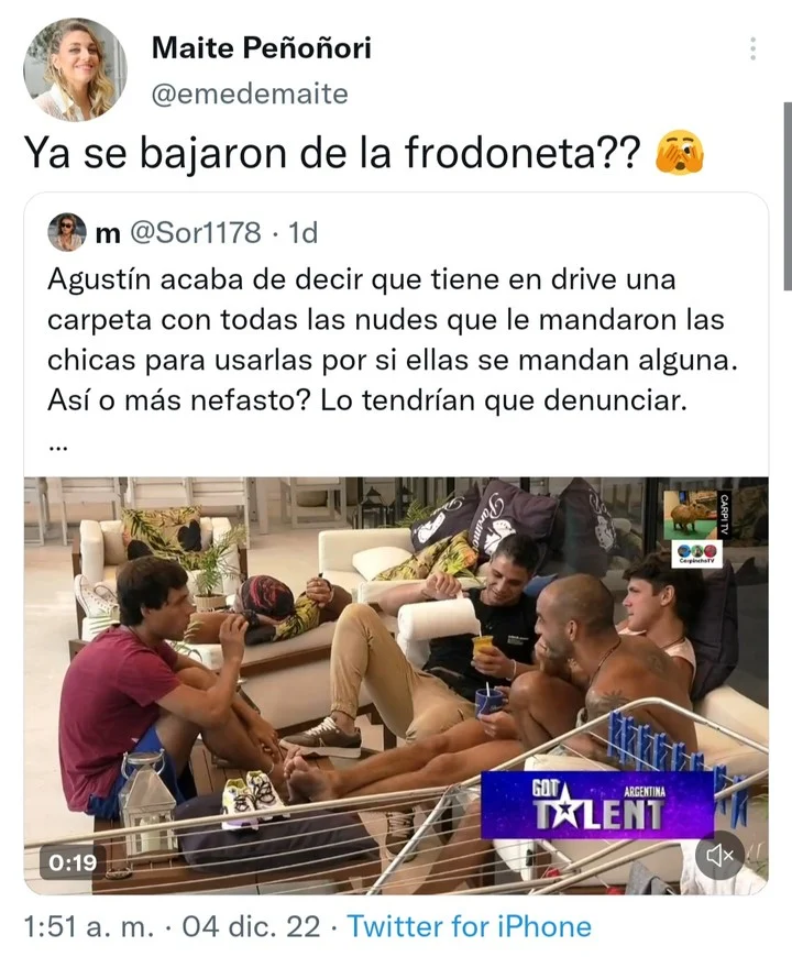 Una de ellas fue Jimena Barón, quien publicó: "Con lo de guardar nudes para extorsionar yo me bajo, che". Mientras que la periodista de Intrusos (América, lunes a viernes a las 13.30), Maite Peñóñori, compartió el video de Agustín y puso: "¿Ya se bajaron de la frodoneta?".