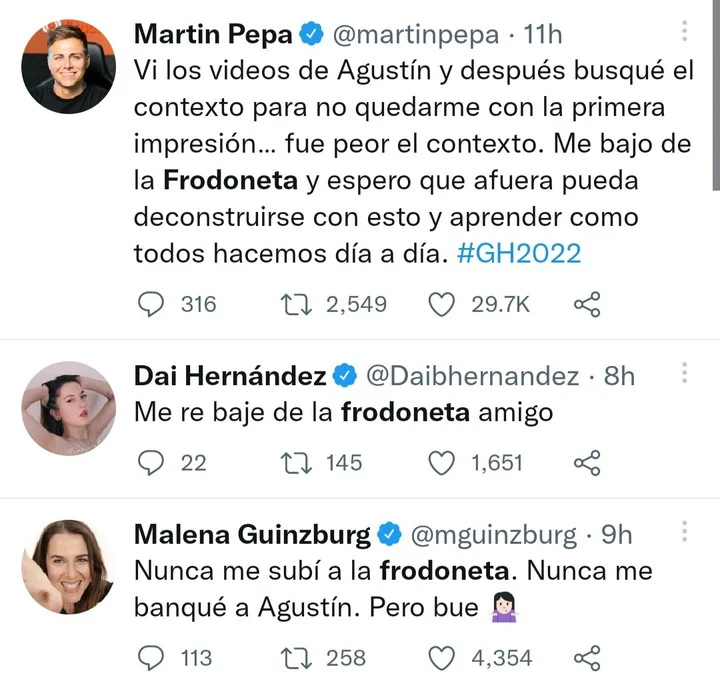 "Vi los videos de Agustín y después busqué contexto para no quedarme con la primera impresión. Fue peor el contexto… Me bajo de la frodoneta y espero que afuera pueda deconstruirse con esto y aprender como todos lo hacemos día a día", escribió por su parte Martín Pepa, exparticipante de GH.