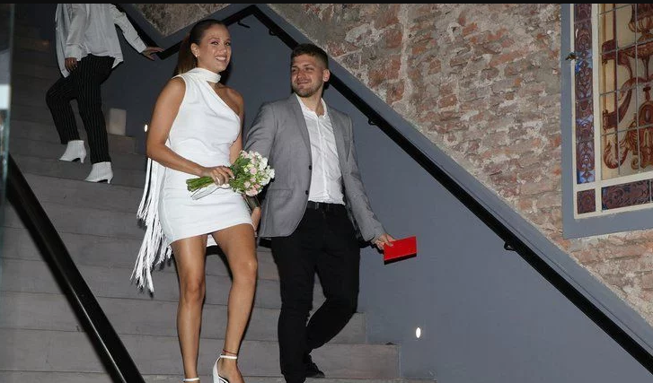 En las fotos, aparecen los dos bajando por una escalera, con la libreta roja en la mano. Lucas llevó una camisa blanca, un pantalón de vestir y un saco gris y Barbie un vestido blanco corto, con un hombro al descubierto y una terminación en la zona del cuello, muy similar a una chalina, con flecos colgando.