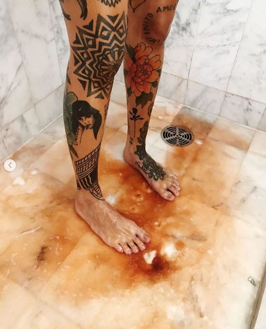 Lelé se limitó a acompañar las fotos con el emoji de un corazón roto y, entre paréntesis, escribió "es tintura", en referencia al charco rojo que se puede ver sobre el piso de mármol de la ducha.