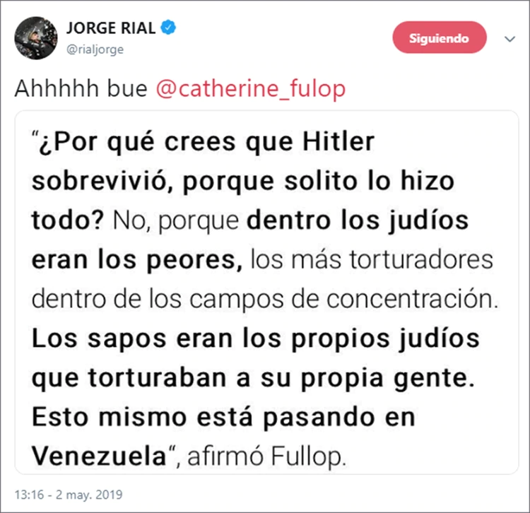 "¿Por qué te crees que Hitler sobrevivió? ¿Porque solito lo hizo todo?", fueron las preguntas retóricas que Fulop le hizo a Marcelo Longobardi en su programa de Radio Mitre. "No, mi amor, porque dentro de (los campos) los judíos eran los peores, los más torturadores dentro de los campos de concentración. No sé si tú sabés la historia: los sapos (NdR: quiso decir "kapos") eran los propios judíos que torturaban a su propia gente, eran los más crueles. Esto mismo está pasando en Venezuela".