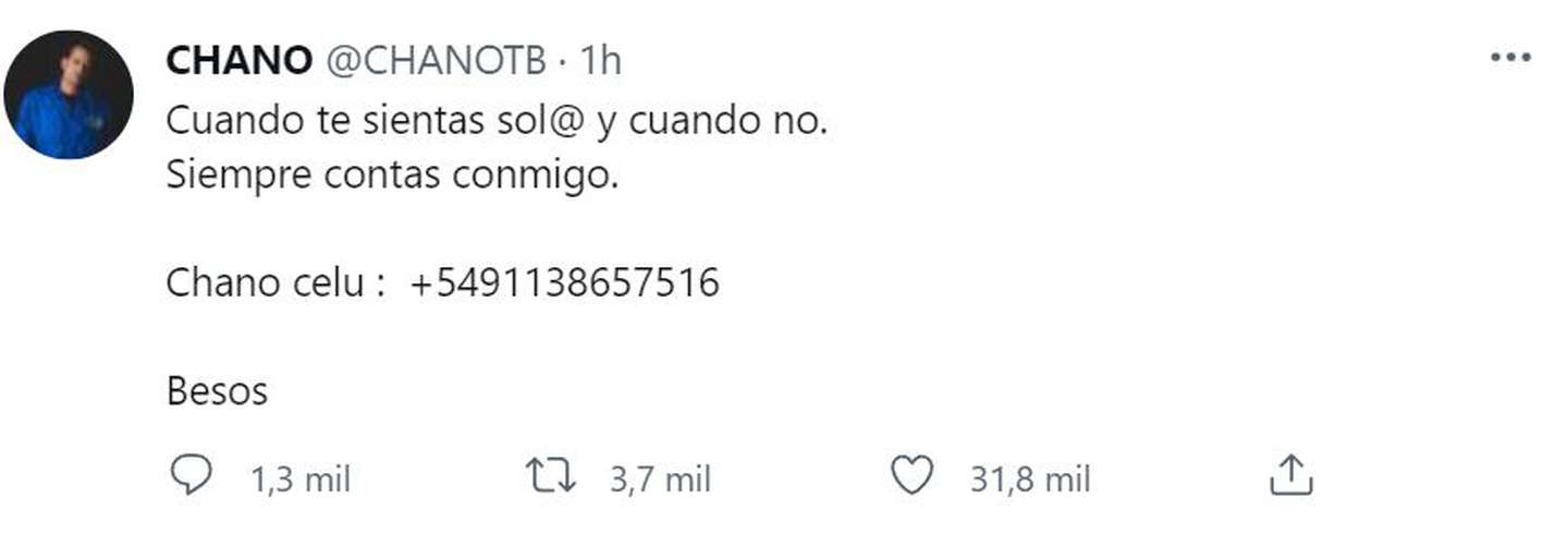 “Cuando te sientas sol@ y cuando no, siempre contás conmigo. Besos”, tuiteo juntó a la forma de contactarlo. Este mensaje tenía una clara referencia a “La Melodía de Dios”, uno de los grandes hits de Tan Biónica. Un dato que ninguno de sus seguidores pasó por alto.