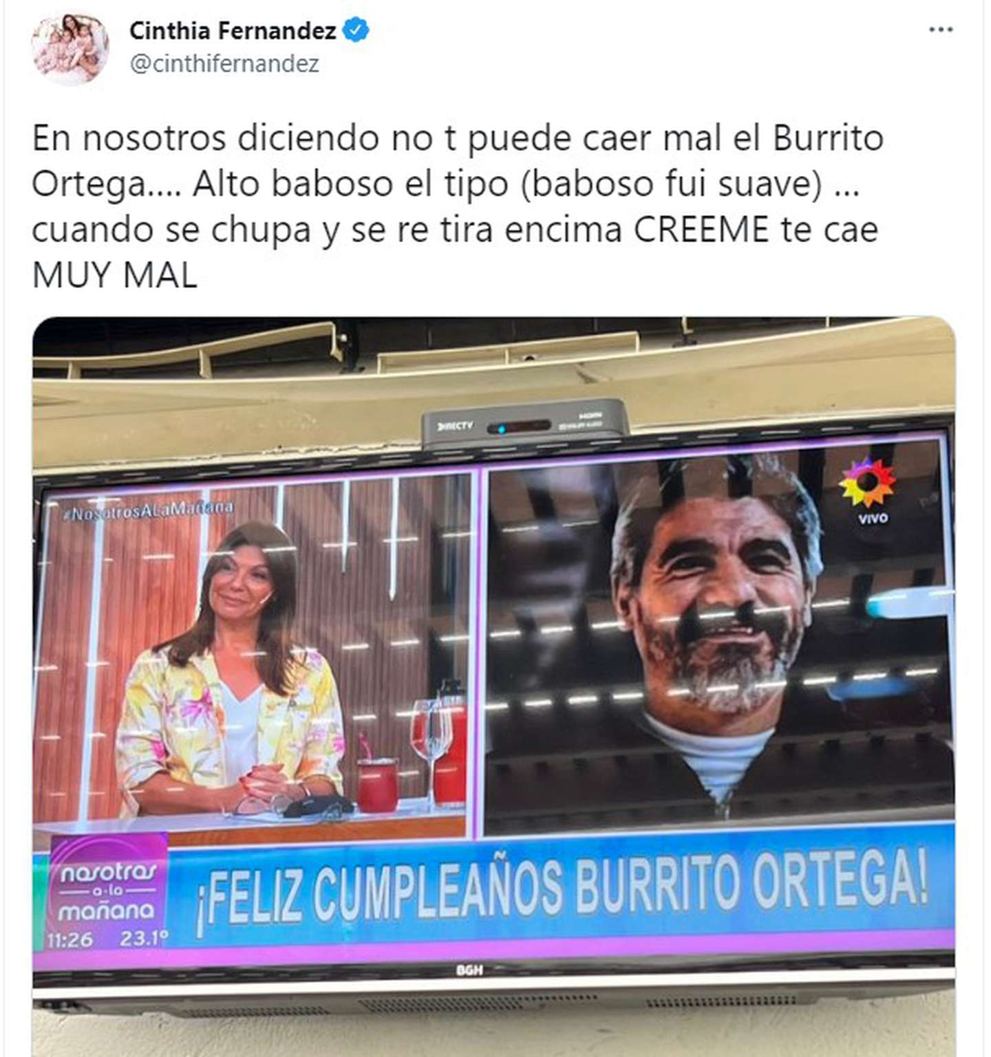 “En Nosotros están diciendo no te puede caer mal ‘el Burrito’ Ortega… Alto baboso el tipo (baboso fui suave)… Cuando se chupa y se te tira encima, creeme te cae muy mal”, escribió la panelista en un tuit que subió junto a una foto del televisor.
