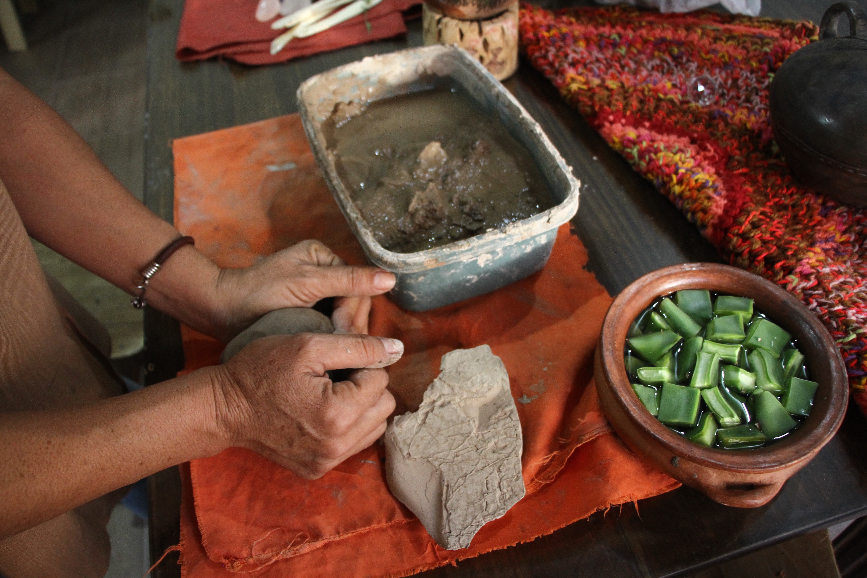 En el volver a las fuentes para la producción, Gabi comienza desde la recolección de arcilla en distintos departamentos para hacer su propia pasta. El procedimiento empieza con la hidratación y en lugar de agua, utiliza "agua de tuna’ que consigue mezclando con agua caliente trocitos de la hoja de esa cactácea. La deja reposar un día y recién la usa. Servirá para darle a la arcilla maleabilidad, la vuelve más plástica. "Es muy agradable, el agua de tuna la deja muy suave, es un placer; antes usaban el agua de tuna para impermeabilizante de las construcciones’, contó.