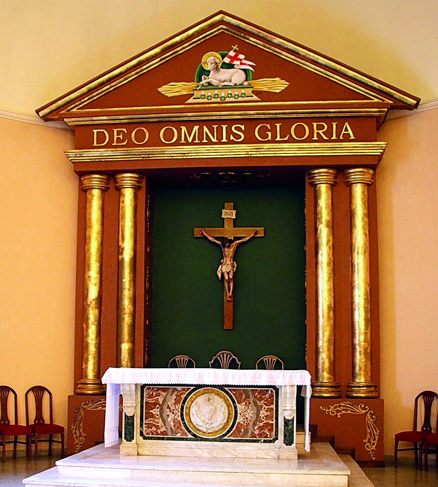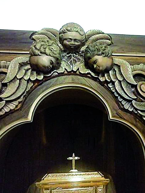 El altar de la capilla del Opus Dei en la sede de los varones, registra el aporte de Estela Milán, la artista sanjuanina que fue recomendada y convocada para hacer ese trabajo, tan colmado de detalles que requiere ser muy minucioso. La obra -tallado y color- comenzó entre 2016 y 2017, rememora Milán. "Estaba armada en parte, con algunos relieves en madera, que estaba muy virgen, por eso también demandó su tiempo. Había algunas tallas empezadas, que tuve que finalizar y hacer otras. Terminé por ejemplo las caritas de los ángeles e hice pintura al óleo a la madera, con restauración del color y el dorado a la hoja del sagrario", contó la artista, quien explicó que "hay un artesano escultor que las hace, todas iguales, para las diferentes sedes del Opus que hay en otras provincias. Él las empieza y luego en cada provincia adonde va la obra, se busca a alguien que termine ese trabajo".