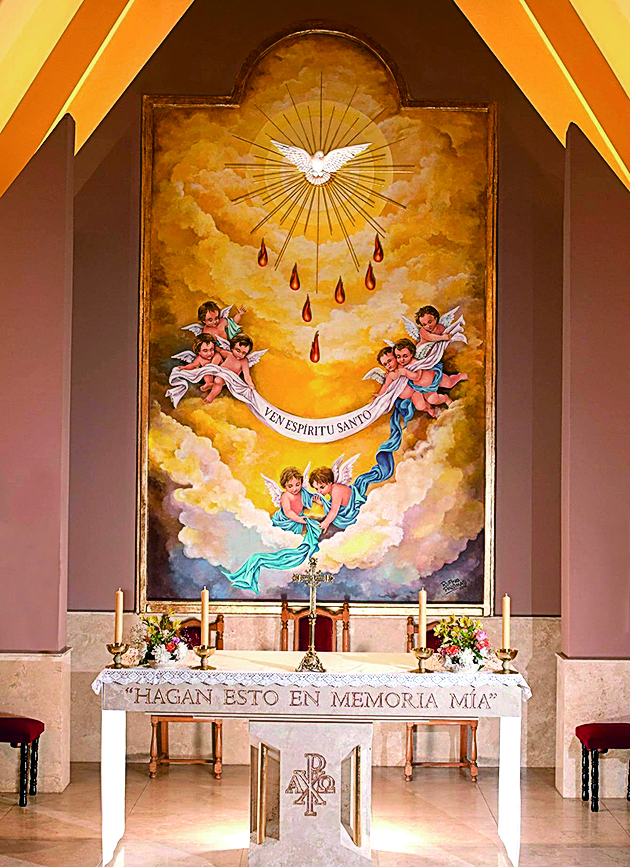 "En la del Bautisterio está la figura de Dios, como entregando el Espíritu Santo, rodeado de querubines, entre nubes y rayos dorados. En la del Santísimo, hay ángeles con un texto en latín que me dio el sacerdote. Uno de los querubines tiene un racimo de uvas moscatel, por Albardón; otro tiene una azucena, que es la flor de la Virgen, otro tiene un ramo de espigas y otro un ramo de olivos; cada uno tiene algo como una ofrenda al Santísimo", relató a DIARIO DE CUYO Palomas. Están confeccionadas en acrílico y con un fijativo especial para conservarlas. "Las pinté yo solo. Cuando las hice me daba vuelta y tenía a todos mirando cómo pintaba. Yo digo que uno es un instrumento, ahí está la mano del Espíritu Santo", dice el artista de profunda fe, para quien esta fue su primera experiencia en murales.