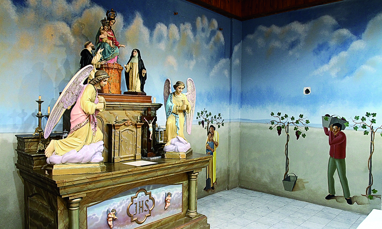 Afuera, un Jesús resucitado de estilo medieval, realizado en cemento con estructura de hierro, parece dar la bienvenida al interior, donde se luce el mural. "La idea fue mía. Sí me pidieron que hiciera alusión a agricultores, ya que Nuestra señora de Pompeya es patrona de los agricultores, por eso hay escenas de viñas, de vendimia. Pero hacia arriba el cielo se transforma como en una noche, hay estrellas y galaxias, que es muy de la temática mía. Está pintado en látex como fondo y ajustes de detalles en óleo.