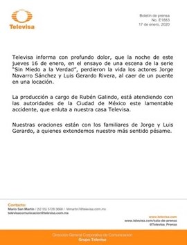 El Grupo Televisa informó por medio de un comunicado que los actores Jorge Navarro Sánchez y Luis Gerardo Rivera murieron este viernes a la madrugada mientras se ensayaba una escena de la serie “Sin Miedo a la Verdad”. La empresa dio a conocer que los actores cayeron de un puente mientras se practicaba para las grabaciones.
