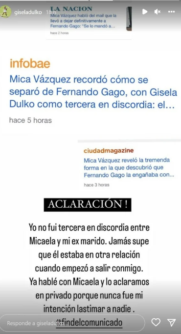 "Yo hablé con Micaela y lo aclaramos en privado, porque nunca fue mi intención lastimar a nadie. Fin del comunicado", sentenció, tajante.