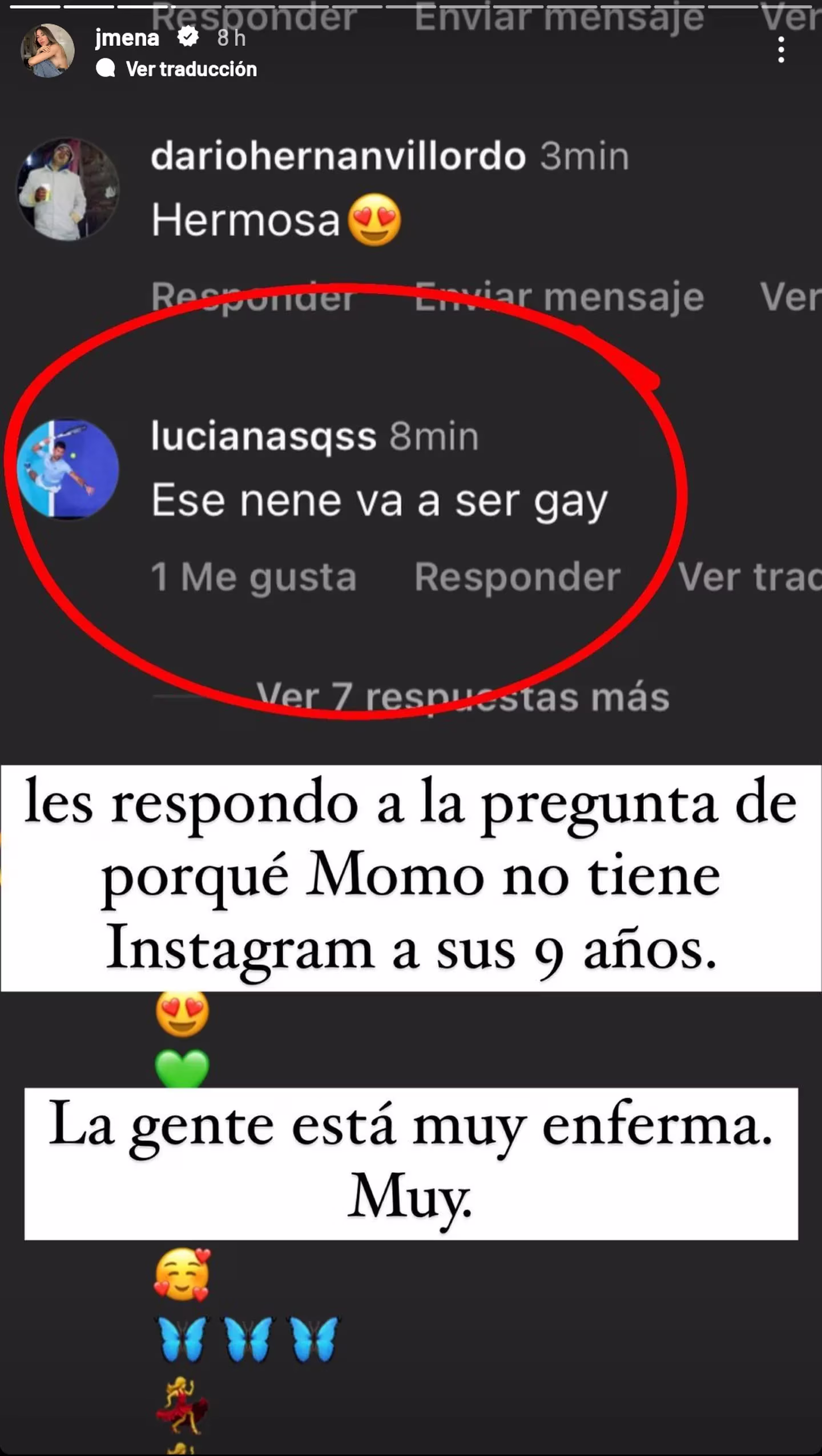Entre varios comentarios que recibe a diario en sus posteos, se detuvo en el de una mujer que escribió: “Ese nene va a ser gay”. Ante ese mensaje, la cantante expresó: “Les respondo a la pregunta de por qué Momo no tiene Instagram a sus 9 años”.