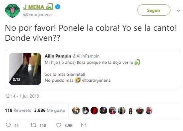 "Mi hija de cinco años llora porque estoy escuchando a Yatra y no quiero ponerle la canción", escribió la usuaria junto a la desgarradora grabación que le tocó el corazón a la cantante, que respondió: “¡No, por favor! ¡Ponele ‘La cobra’! Yo se la canto. ¿dónde viven?".