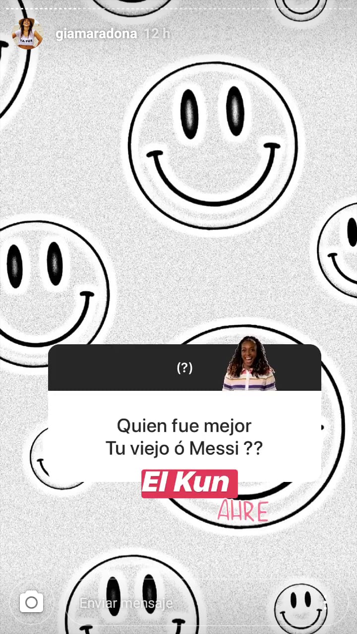 Gianinna Maradona respondió una serie de preguntas que le hicieron sus seguidores en Instagram y una de ellas se refirió a la polémica dicotomía sobre "Messi o Maradona". Fiel a su estilo ácido, la hija del Diez respondió: "El Kun (ahre)".