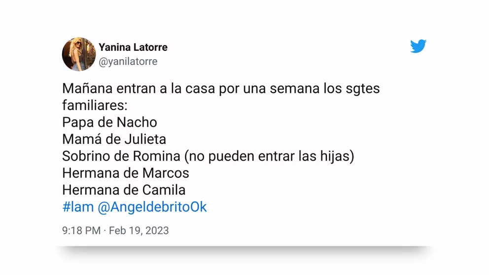 En medio de este contexto, Yanina Latorre reveló en Twitter la identidad de quiénes participarían en el ciclo conducido por Santiago del Moro. “Mañana entran a la casa por una semana los siguientes familiares: “Papá de Nacho. Mamá de Julieta. Sobrino de Romina (no pueden entrar las hijas). Hermana de Marcos. Hermana de Camila”.