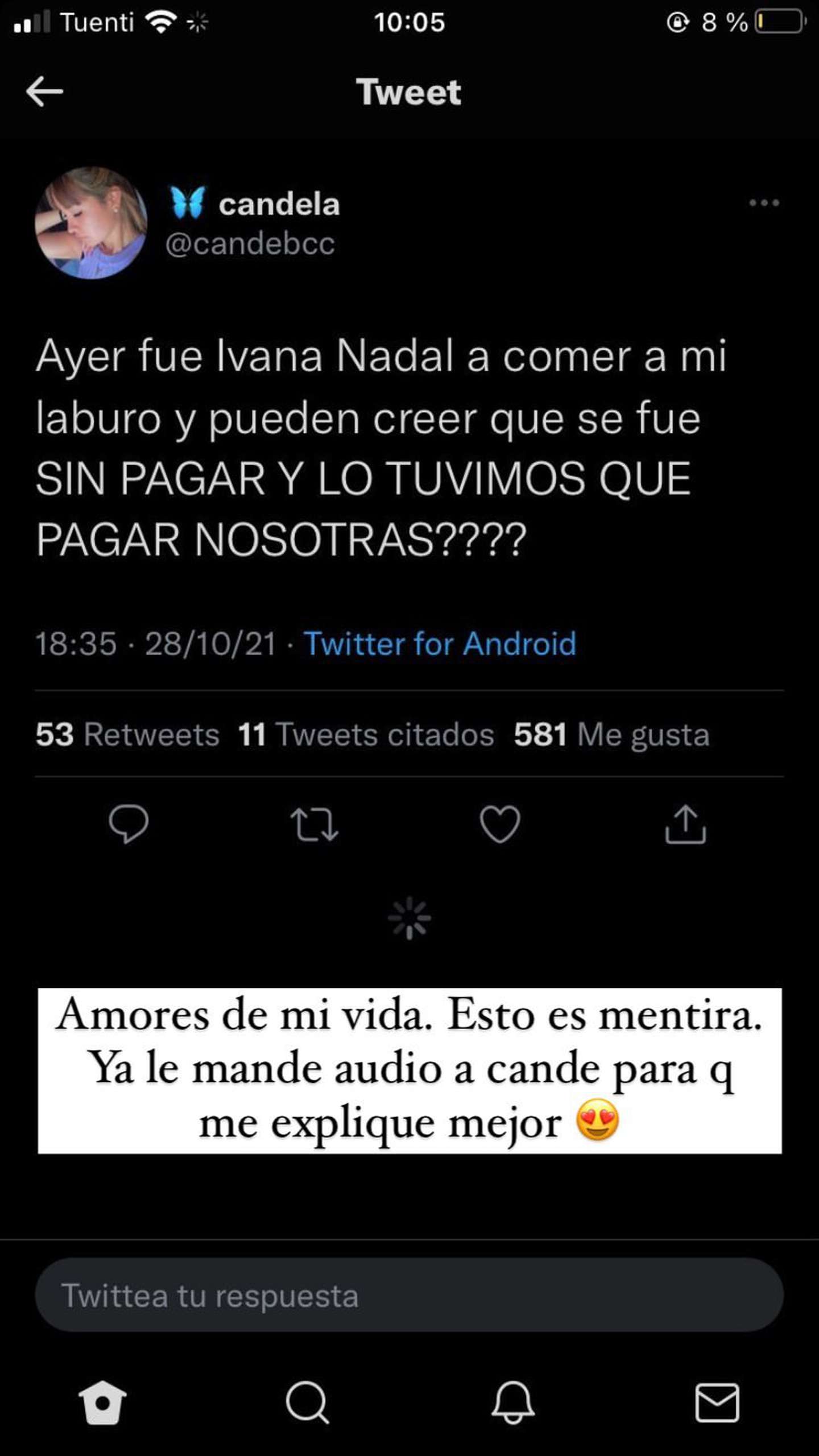 “Hola Cande. ¿Todo bien? ¿Vos hiciste un tuit donde dijiste que yo me fui de un restaurante sin pagar y lo tuviste que poner vos? Quería saber dónde trabajabas y cuánto habías pagado, porque el único lugar donde fui fue una invitación. Pero si te lo hicieron pagar pasame tu cuenta y listo, ningún problema”, preguntó.