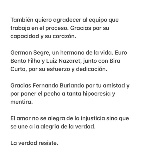 “Entonces quiero agradecer. Quiero agradecer a Dios, porque cuidaste a mi familia y a la gente que amo y eso es lo más importante”, prosiguió el artista radicado en Brasil, en tanto que también aprovechó para mostrar su agradecimiento hacia aquellos que lo apoyaron: “Y a vos, a cada uno de ustedes que a pesar de esa lucha cotidiana, podían pensar en lo mejor para esto. Claro, lo mejor sería la Justicia, ¿no? Pero la Justicia con sus tiempos, escuchando a todos y no solo una versión, un solo relato, no prejuzgando, no entrando en la condena social. Y lo hacías con mensajes, con un abrazo, con una mirada, con rezos…Y fue importantísimo para nosotros, fue sanador. Y te lo quería agradecer”, sentenció el actor.