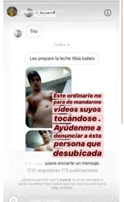 Julieta Nair Calvo se hartó y decidió salir a escrachar públicamente a un hombre que le envió videos masturbándose. “Este ordinario no para de mandarme videos suyos tocándose. Ayúdenme a denunciar a ésta persona desubicada”, expresó la actriz a través de sus historias de Instagram junto a una captura de pantalla del chat donde se ve la cara del acosador.