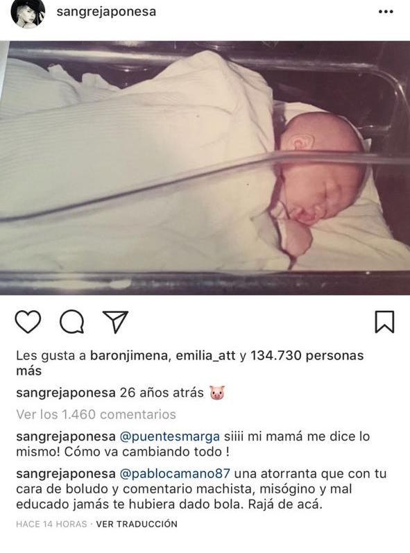 Esta vez, la actriz recibió un fuerte insulto en la foto más tierna, de cuando era bebé, 26 años atrás, que publicó movilizada por la reciente llegada de Magnolia, su primera hija junto a Benjamín Vicuña. La postal recibió más de 100 mil likes y casi 2 mil comentarios, y la China no dejó pasar uno en el que la trataron de “atorranta”.