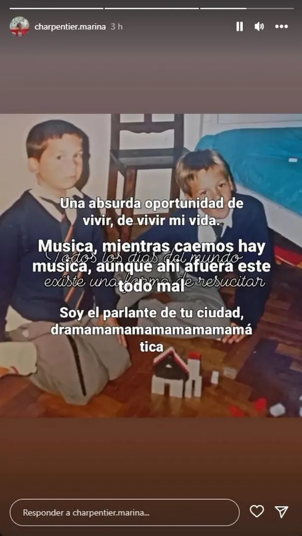 Marina Charpentier musicalizó la historia de Instagram con la foto con una parte de "Música", una canción de Tan Biónica: "Música, mientras caemos hay música. Aunque ahí afuera esté todo mal. Soy el parlante de mi ciudad".