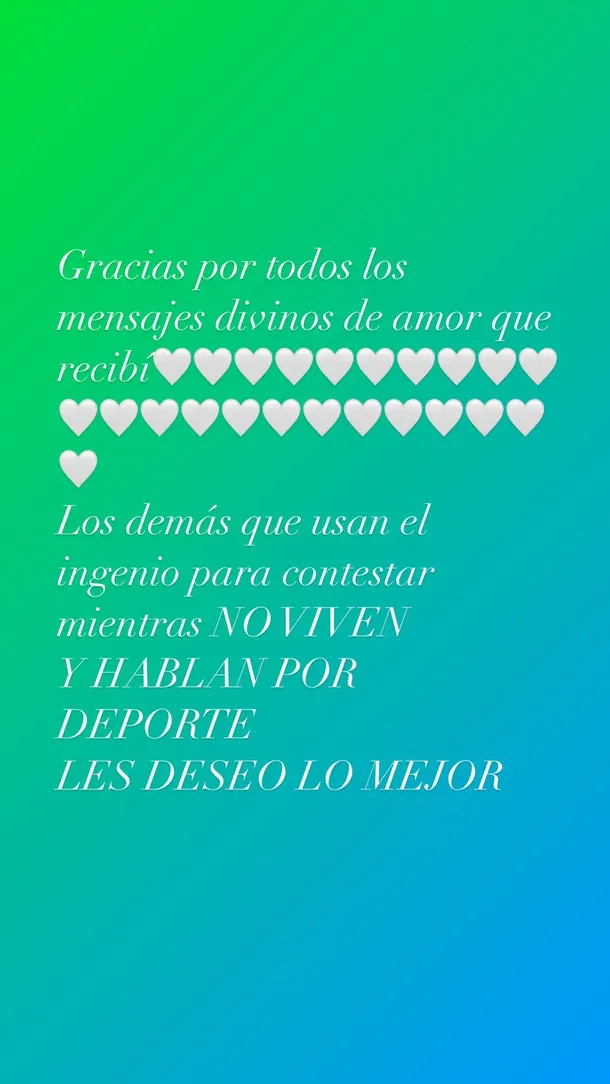 “Gracias por todos los mensajes divinos de amor que recibí. A los demás, que usan el ingenio para contestar mientras no viven y hablan por deporte, les deseo lo mejor”, expuso con ironía en una historia de Instagram a partir de la gran repercusión que tuvo su paso por el ciclo que conduce Andy Kusnetzoff.