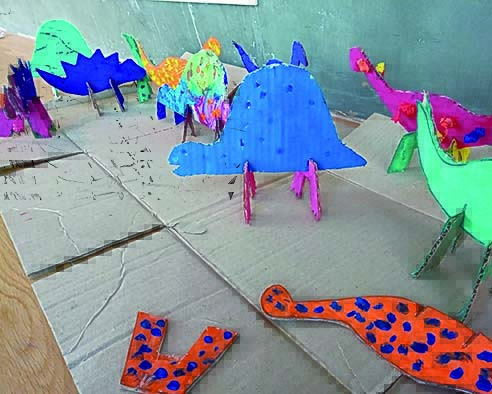 Empleando el gran espacio disponible en la sala central del museo, los chicos se organizaron en distintos grupos respetando los protocolos de distanciamiento. Concentrados en la actividad y ya con los potes de pinturas abiertos, los peques le imprimieron su propia personalidad y estilo a cada figura. Como bautizar con algún nombre o apodo a cada criatura, o dibujarles un barbijo a un dinosaurio.