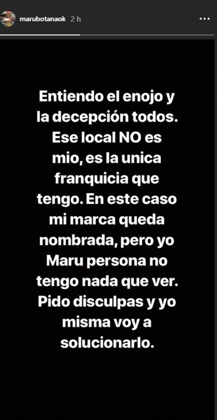 "Entiendo el enojo y la decepción de todos. Ese local NO es mío, es la única franquicia que tengo. En este caso mi marca queda nombrada, pero yo Maru Botana, no tengo nada que ver. Pido disculpas y yo misma voy a solucionarlo", sentenció.