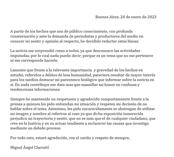"Pareciera resultar de mayor interés para los medios destacar mi parentesco biológico que informar sobre la noticia en sí. En nada contribuye ese dato más que mancillar mi honor en confusas y tendenciosas informaciones", continúa el texto.