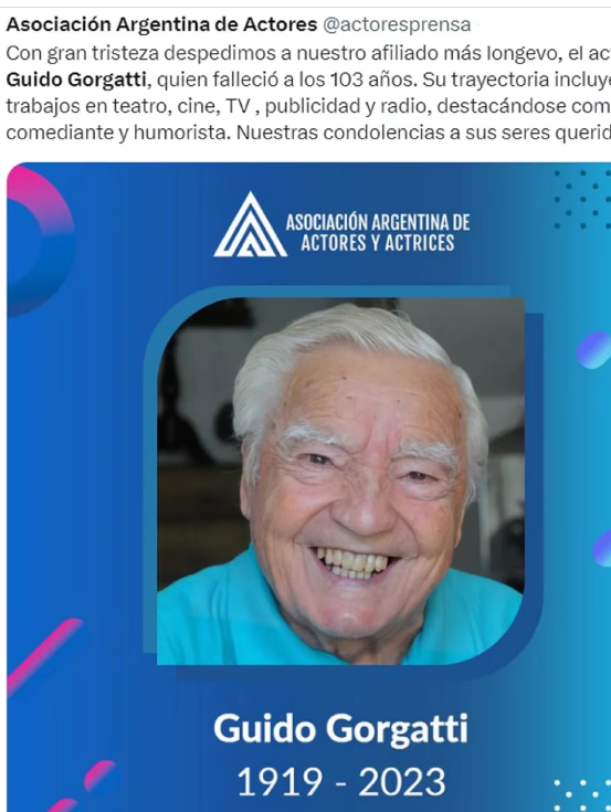 “Con gran tristeza despedimos a nuestro afiliado más longevo, el actor Guido Gorgatti, quien falleció a los 103 años. Su trayectoria incluye trabajos en teatro, cine, TV , publicidad y radio, destacándose como comediante y humorista. Nuestras condolencias a sus seres queridos”, reza el parte difundido este jueves para anunciar la muerte del querido artista. Aún se desconocen el motivo del deceso del actor.