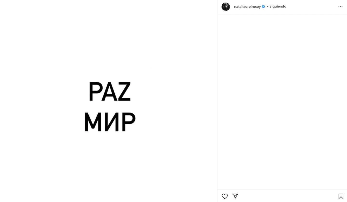 Un día después de que estallara el conflicto, la artista usó su cuenta oficial de Instagram para manifestarse sobre lo que estaba ocurriendo en sus historias. “Queremos la paz”, escribió en español y en ruso. Ahora, Natalia Oreiro volvió a pedir que termine la guerra con un posteo en la misma red social. “Paz”, dice la simple postal que presenta la palabra en ambos idiomas con letras negras sobre un fondo blanco.