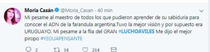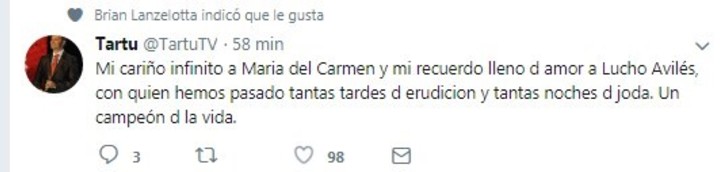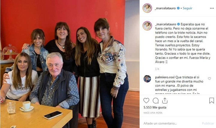 Una de las más conmovidas con la partida de Lucho fue la periodista Marcela Tauro, quien a través de un posteo en Instagram le dedicó unas sentidas palabras: "Esperaba que no fuera cierto. Pero no deja sonarme el teléfono con la triste noticia. Aún no puedo creerlo… Tenías sueños, proyectos. Estoy llorando. Ni yo sabía que te quería tanto. Gracias por todo lo que me diste. Gracias por confiar en mí. Fuerza María y Álvaro".