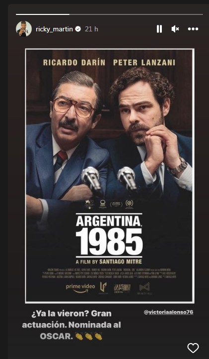 Mientras lleva adelante su gira sinfónica por el país, Ricky Martin aprovechó para ver Argentina, 1985, la película protagonizada por Ricardo Darín y Peter Lanzani que competirá en los Premios Oscar en la categoría mejor film internacional. Al parecer, el músico disfrutó mucho el film y no dudó en recomendarlo a sus más de 17 millones de seguidores.