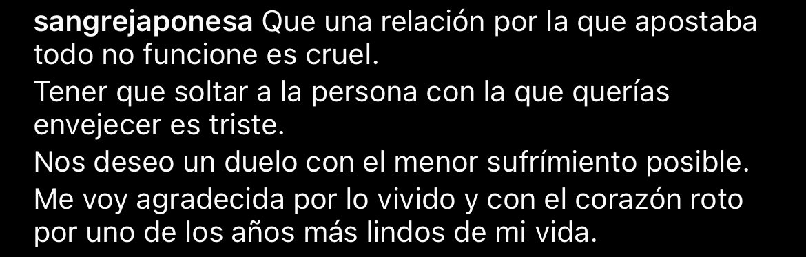 Y la confirmación llegó el jueves último, cuando la actriz a través de la misma vía publicó un escrito que no dejó lugar a dudas: “Que una relación por la que apostaba todo no funcione es cruel. Tener que soltar a la persona con la que querías envejecer es triste. Nos deseo un duelo con el menor sufrimiento posible. Me voy agradecida por lo vivido y con el corazón roto por uno de los años más lindos de mi vida”, escribió la actriz expresando su dolor y angustia. Y acompañó el texto con un video de recuerdo de cuando todo era risas y amor entre ellos y se hacían caricias.