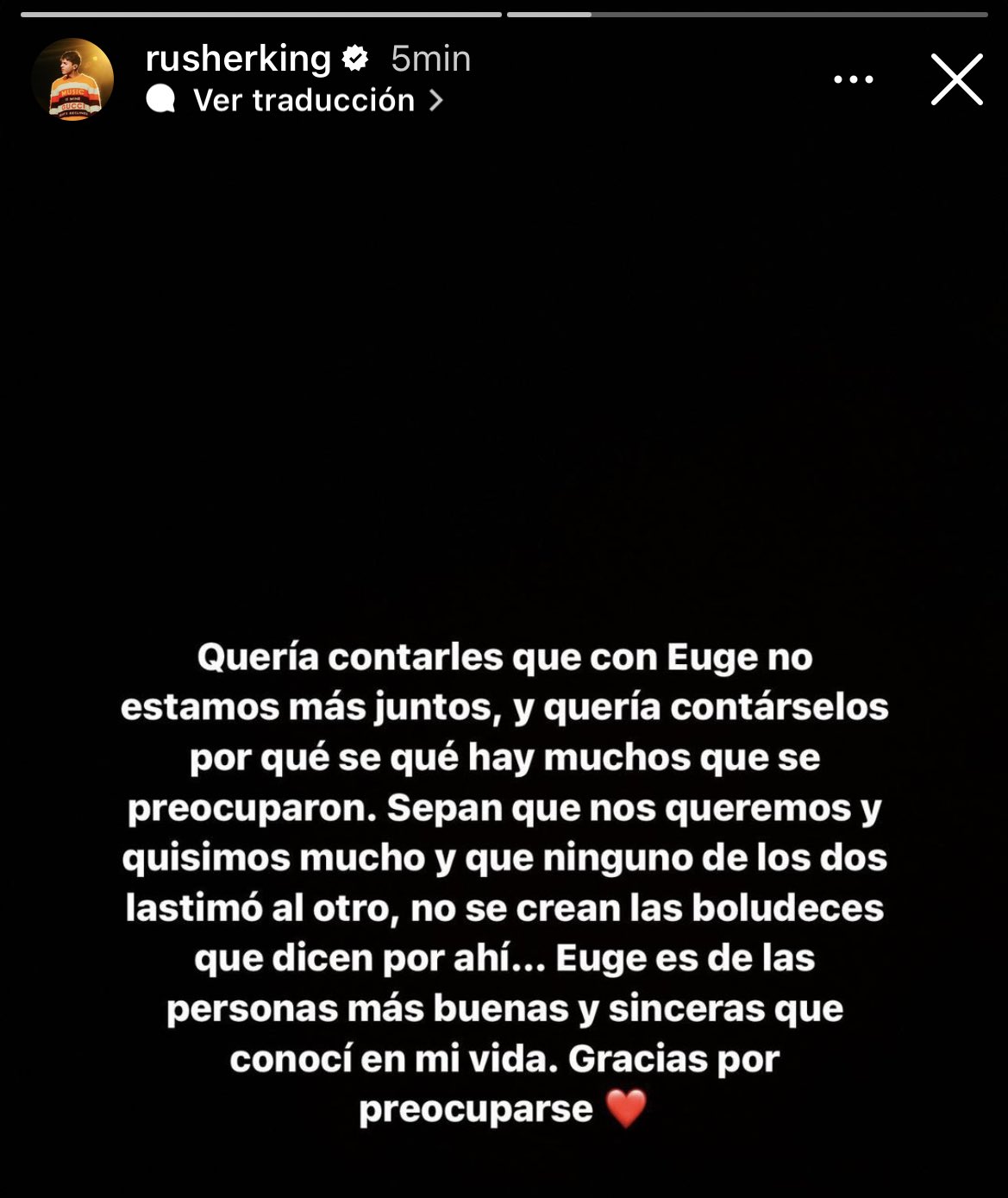 Thomas Nicolás Tobar -tal es el verdadero nombre del músico-, por su parte, fue un poco más frío: escribió un comunicado en sus Historias, de manera tal que solo permanecerá durante 24hs en sus redes. “Quería contarles que con Euge no estamos más juntos, y quería contárselos porque se que hay muchos que se preocuparon. Sepan que nos queremos y quisimos mucho y que ninguno de los dos lastimó al otro, no se crean las boludeces que dicen por ahí. Euge es de las personas más buenas y sinceras que conocí en mi vida. Gracias por preocuparse”, indicó el cantante.