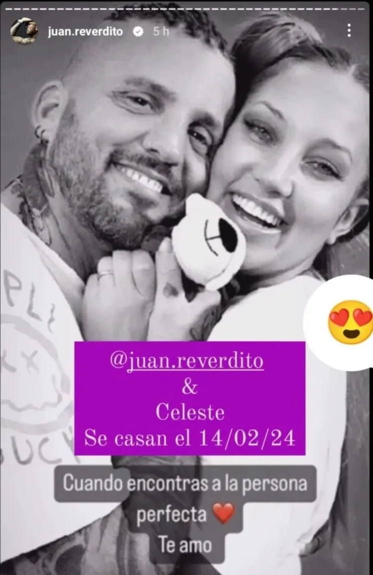 Tras unos duros meses luego de ser eliminado de la casa de "Gran Hermano Argentina", llega una alegría a la vida de Juan Reverdito: el taxista de "GH" anunció su casamiento con su novia, Celeste Rigoni. Así lo confirmó en su cuenta de Instagram, donde compartió la fecha de las futuras nupcias.