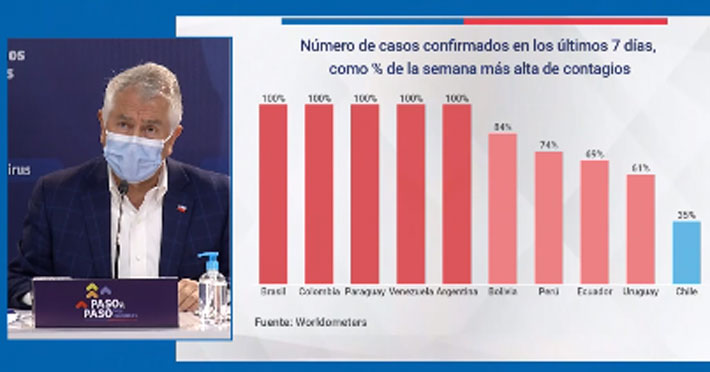 En esta misma línea, el ministro lamentó que "desafortunadamente hay otros países que siguen con una gran cantidad de casos confirmados en los últimos siete días, llegando a un 100%, o manteniendo el 100% de cantidad de casos confirmados en las semanas de más alto contagio".